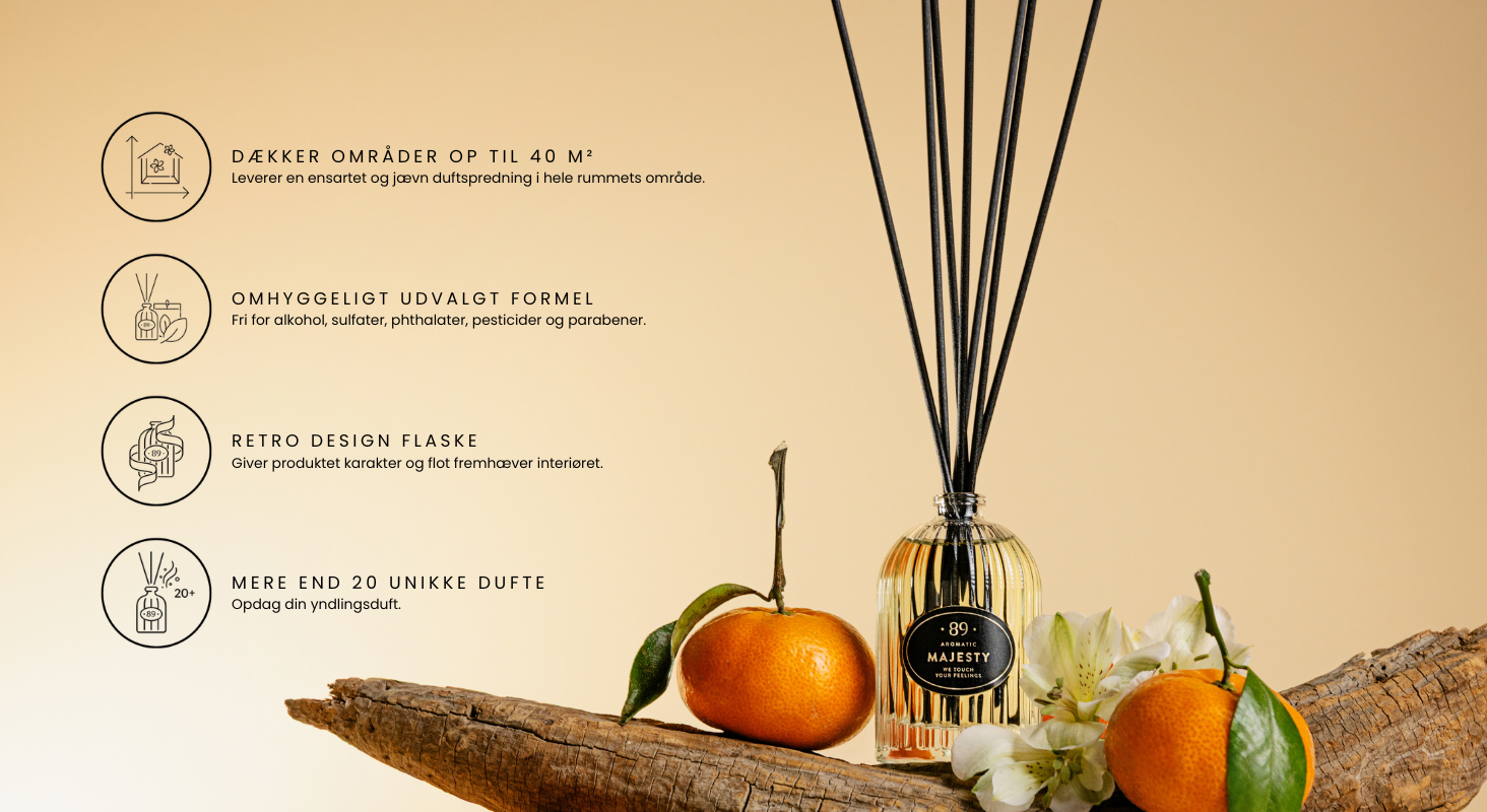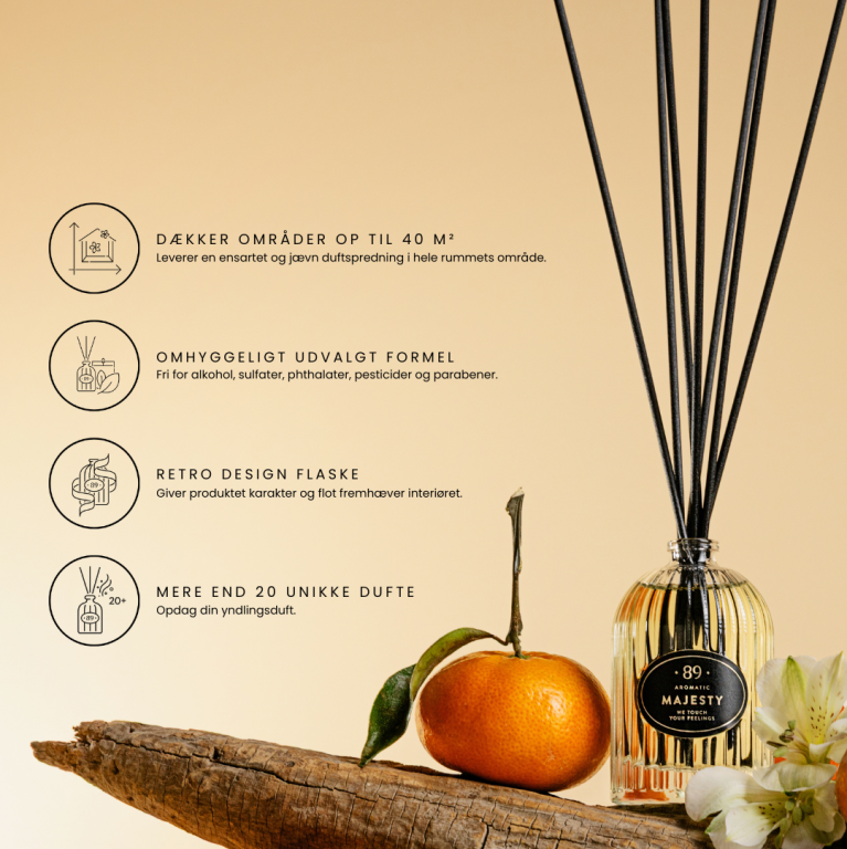 Placer blot duftpindene i flasken og lad duften sprede sig naturligt. Juster intensiteten ved at tilføje, fjerne eller vende pindene.
